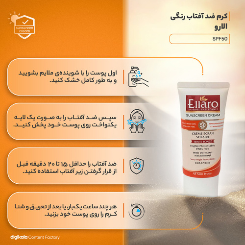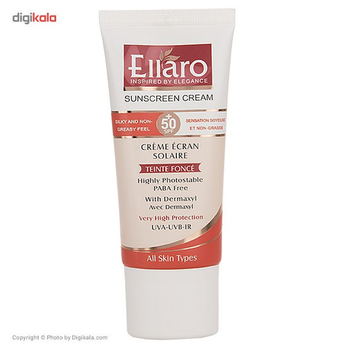 کرم ضدآفتاب برند «الارو» (Ellaro) 50 میلیلیتر حجم دارد و دارای SPF50 است که محفظهای تیوپی از جنس پلاستیک دارد. رنگ ضدآفتاب الارو بژ طبیعی است. مدل «Teinte Fonce» حالت کرمپودری دارد که کاربردی دوگانه برای این کرم محسوب میشود. یعنی هم در مقابل اشعههای UVB و UVA و سایر اشعههای مضر خورشید از پوست محافظت میکند و هم برای آرایش پوست و پوشاندن عیوب صورت مناسب است. میزان اسپیاف کرم الارو 50 است اما عملکردی همانند کرمهای ضدآفتاب 50 به بالا دارد وهمان محافظت را برای پوست ایجاد میکند. وجود مادهای بهنام «Dermaxyl» خاصیت ضدچروک دارد و قادر است چینوچروکهای ریز پوست را ازبین ببرد. الارو دارای ماده آبرسان جهت حفظ رطوبت پوست است که اجازه نمیدهد پوست خشک شود. کیفیت بالای محصولات الارو که دارای کد مجوز بهداشت هم هستند، این محصولات را به انتخابهایی عالی مبدل میکنند.