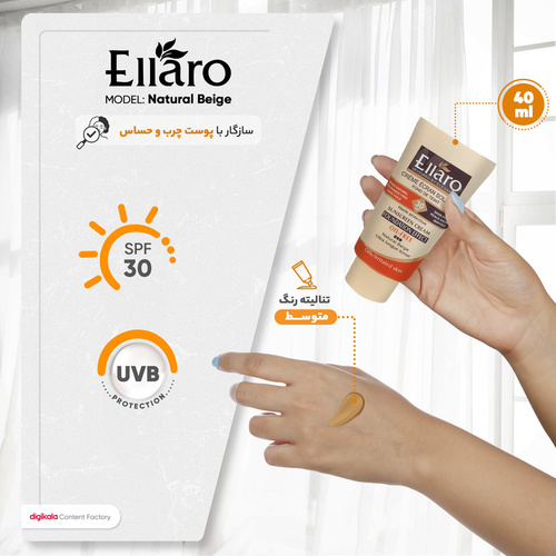 کرم ضد آفتاب رنگی الارو SPF30 سری Foundation Effect مدل Natural Beige محافظ UVB، مناسب پوستهای چرب و حساس تحت لیسانس حجم 40 میل